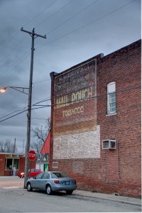 Today I was out looking for a good barn to try out some HDR on. For some reason though I did not find one that was accessible from the road. The barns that looked good were all behind a house or something that I could not shoot through. I had given up the chase because it was too dark, and settled in to try and shoot a Christmas scene in the small town of Otterbein. Otterbein is a small town of about 1,200 just west of Lafayette. I tried a couple shots in the fading light of the town gazebo decked out for the holiday, but did not think that I would like the result. As I started walking back to my car I noticed the ad on the side of the building. I decided to try an HDR here. With the low light available I did not think that it would turn out, but I kind of like how it looks. I may try another older brick building tomorrow to see how it turns out.