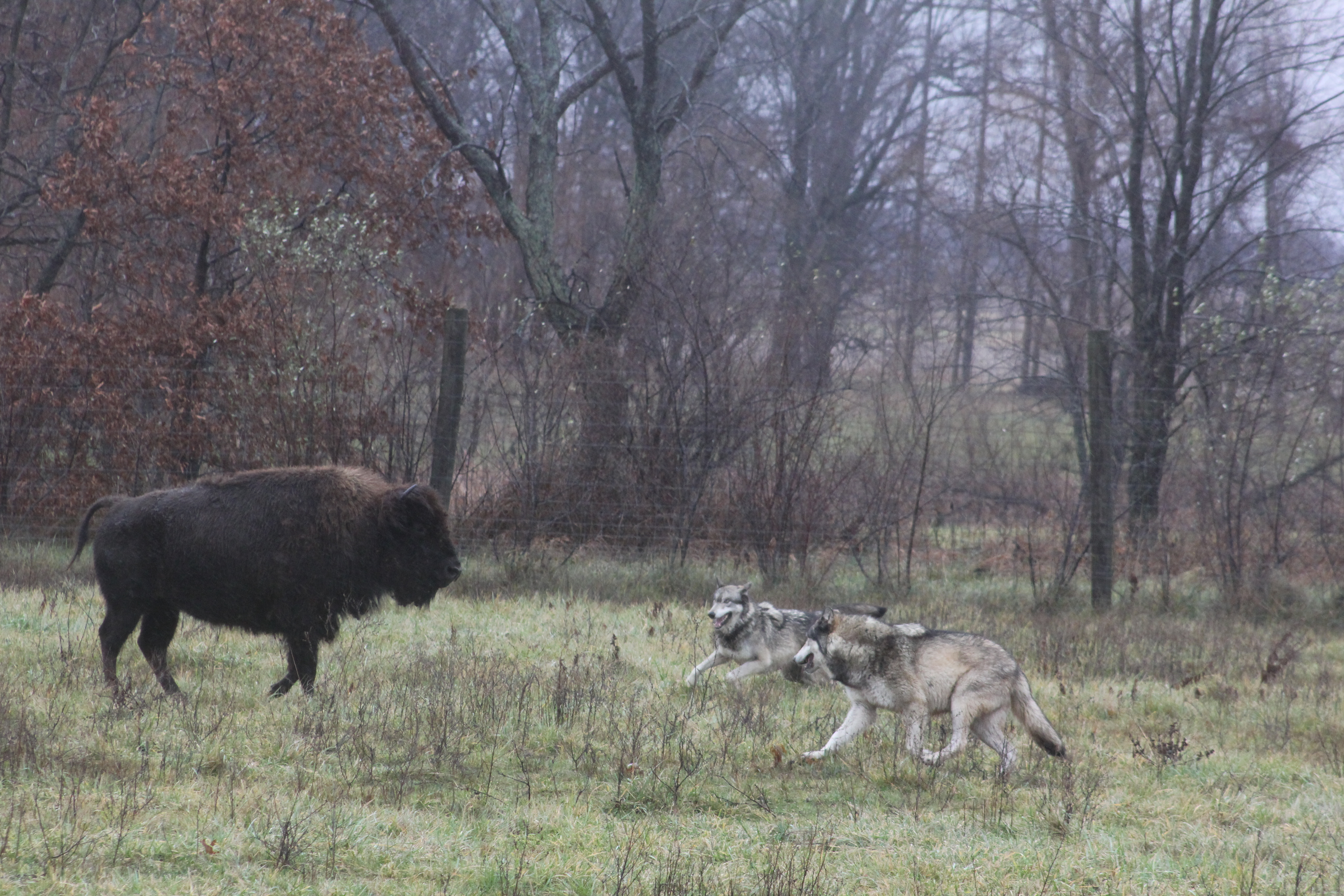 Today I wanted to visit Wolf Park again to see the weekly demonstration they put on pitting two wolves against a herd of Bison. The last time I went the demonstration was really poor. I was hoping for something better this time. The weather was terrible, but I had an umbrella to shield me from the soaking rain. As soon as I heard what two wolves would be brought out I thought “here we go again.” They were the two that were more focused on rolling in bison dung than testing the herd last time. Early on I thought that it would be more of the same. In fact I think they were getting ready to call it a day when all of a sudden they spotted the calf that strayed just a little too far away. They started after it, and the hunt was on. I just watched a show on bison last night that went into detail how this goes on. What unfolded today was just like the show I watched. The wolves tested the herd, and separated one from the rest. Then they tried to get an advantage over it. That is not very easy when the wolf is as undersized as it is. This was the last weekend that the park was open, and I am glad that I was able to see the last show. Even more important was that the show was a good one.