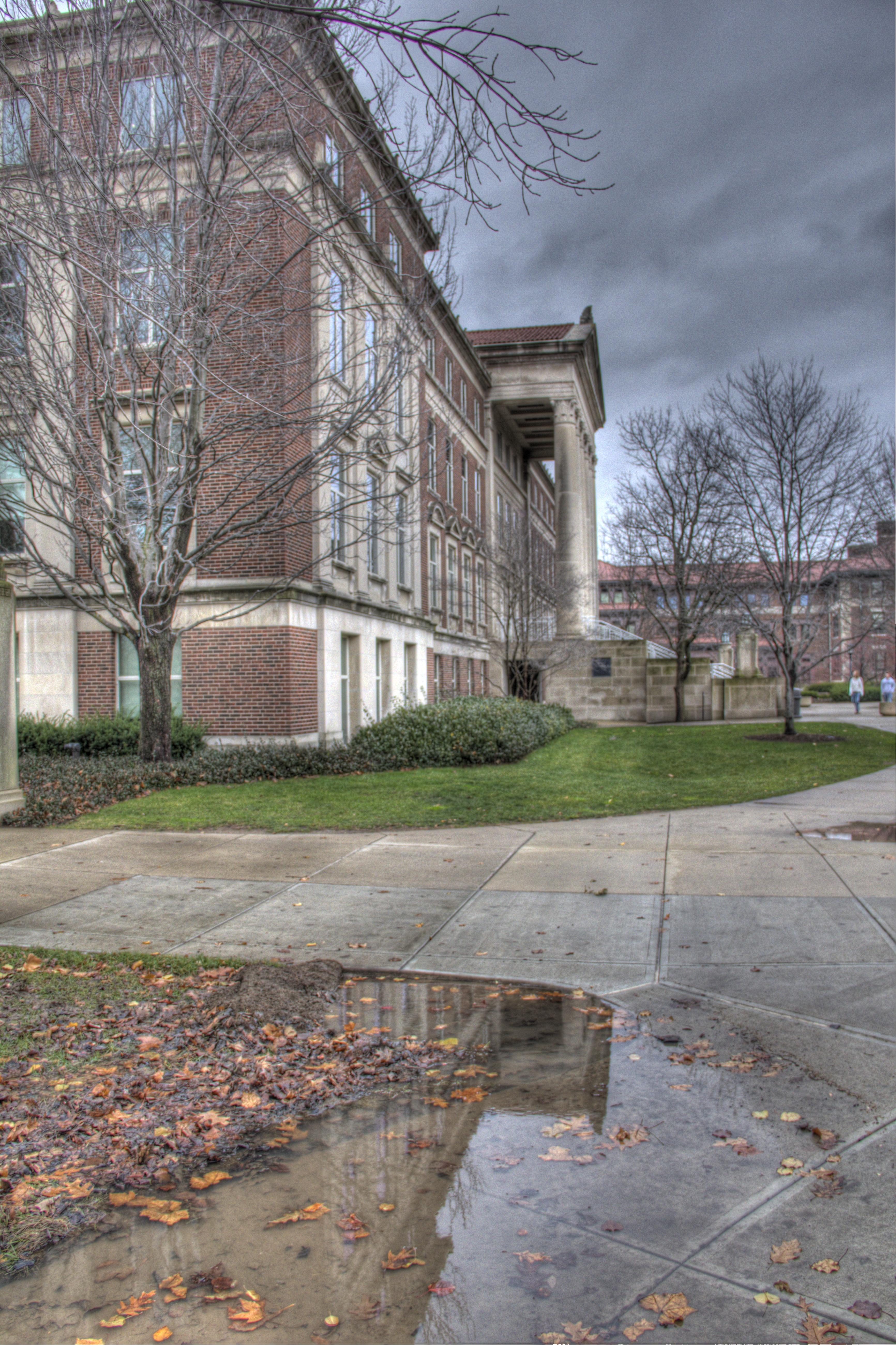 I was on campus today to see the Purdue women take on #4 Texas A&M. If you are interested I have some pictures that I liked from the game on my other blog here. I got to the game early because it was not raining, and I knew that I could have a few minutes almost alone on campus. My main goal was to get an HDR image of the clock tower that sits famously over campus. I actually did get a good picture, but on my way back to the stadium I spotted this scene. I wanted to test the shot with the water from the recent rain. The reflection looks great in HDR, and I thought that since I am almost two months into this endeavor it would be a good picture for today. Hovde Hall is right at the center of campus as far as academics goes. The fountain is in front of it, and the clock tower is to it’s left. Sometimes it gets lost in the shuffle, but today it is the focus of this blog.