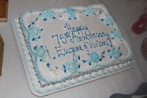 Today once again I really did not have time to take any pictures. I did however get to take a couple at work. A couple at my place of business celebrated their 75th wedding anniversary today. Just stop and think about that. I hope to live to be 75 let alone be married for that long. These are two special people who have done something that I don’t think will be repeated too much in this day and age. I have a couple of pictures of the duo, but I didn’t think that I should post them without their permission. I did however take this picture of their cake. I wasn’t trying to be too fancy, but I just wanted a shot of it before it was cut up too much. I squeezed in, and tilted in order to get it all in from my vantage point. I was happy to be a part of their special day, and since this blog is about my life I thought that this picture was a good representation of what I did today.