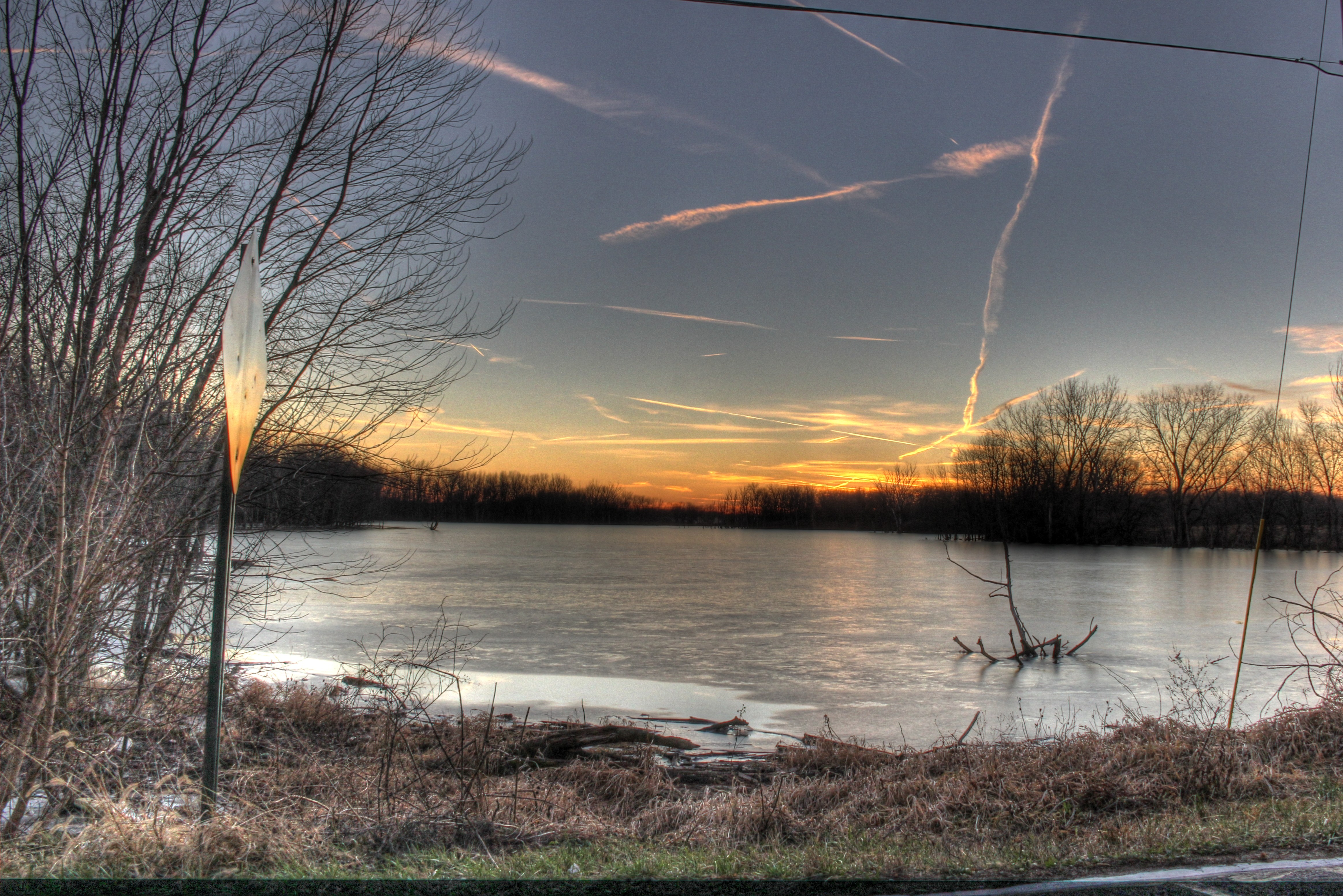 Tonight I got off of work just before the sunset again. In fact I missed most of the great light right before the sunset. So once again my picture for the day is of the sunset. I knew a great little pond/lake just down the road from where I work and live. I knew that I would be close to getting a good shot just by driving by. Luckily nobody was behind me so I stopped and took a couple pictures. By a couple I mean twelve. I took two sets of six bracketed exposures in order to make two HDR pictures. I took one set from dead on, and then backed up about thirty feet to get the shot that you see above. I thought that the angle was better, and also the curve sign adds a little to the shot overall. I wish that I had showed up a couple minutes before when the light was more on the ice. A couple minutes at sunset is an eternity. The good news for the second day in a row is that I can improve on this picture. Luckily in a 365 project I have plenty of time for that.