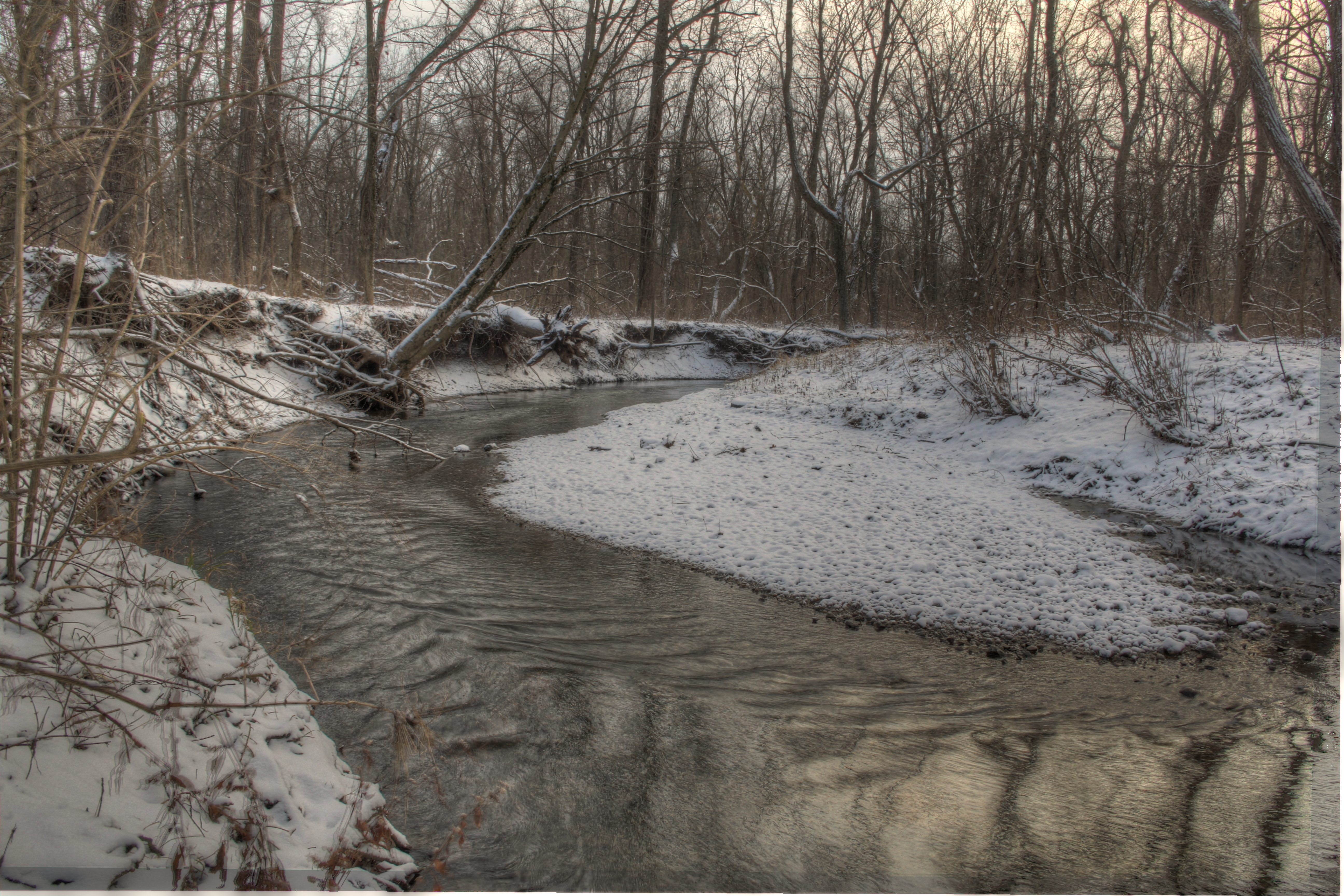 Today I knew that I did not have a lot of daylight left when I left work. I decided to head to a spot that I had seen a few weeks ago when I was scouting out barns to try out some HDR on. Without leaves this location was not very good, but I knew that it might look okay with some snow on the ground. When I drove by I knew that I was right. I parked just off the road, and trekked down to the waters edge. I was very pleased with the way it moved around the location I first walked up to so I snapped this picture. Actually I snapped six of them, and merged them into an HDR image. I thought that the HDR process would smooth out the ripples that were in front of me. If that had happened I was going to just post one of the six pictures for today. I was very surprised that it did not have an issue with the water ripples. I like this shot, but I might have to give this location another try on another day. I would like to shoot at least a little more on the overexposed side of the spectrum to maybe get some more light into the scene. The best part about this shot was that there was no wind in the woods. With the wind whipping around it would have seemed much colder than it did.