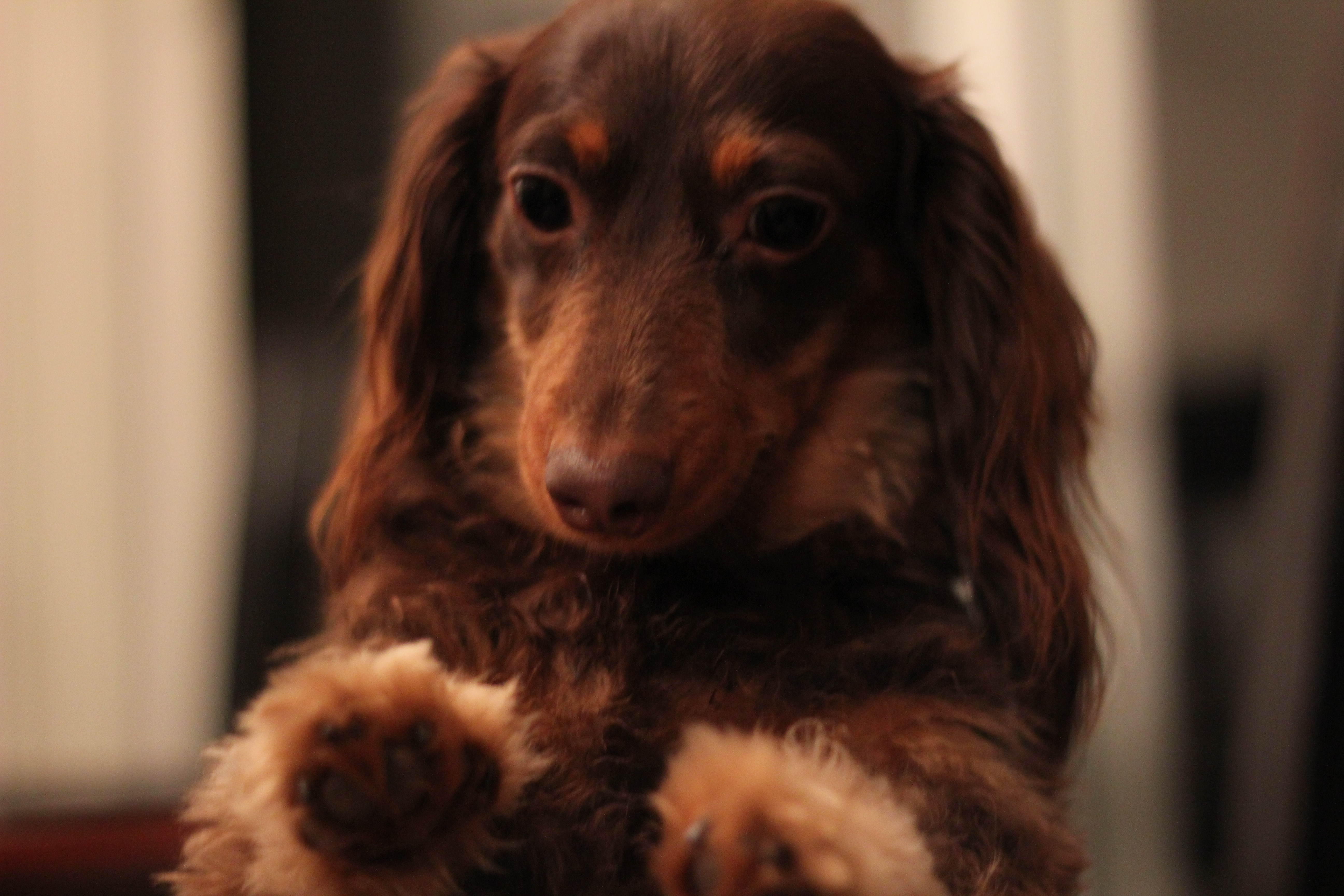 Tonight it was getting late again, and I did not have a picture yet. It was a nasty day and night so shooting outside would have been very wet. I went over to my brothers to get a picture there. Of course there I have cute little dogs to shoot so I knew that even by chance I would get something good. This picture was by accident. I was shooting the puppy Riot when I heard the familiar grunt that meant that the other dog Mocha had moved up on two legs in what I call the prairie dog. She is very camera shy so when I turned to get her picture she started to go down. I turned and snapped, and this was the result. It is not the sharpest picture that I took today nor is it the best exposed, but I liked it.