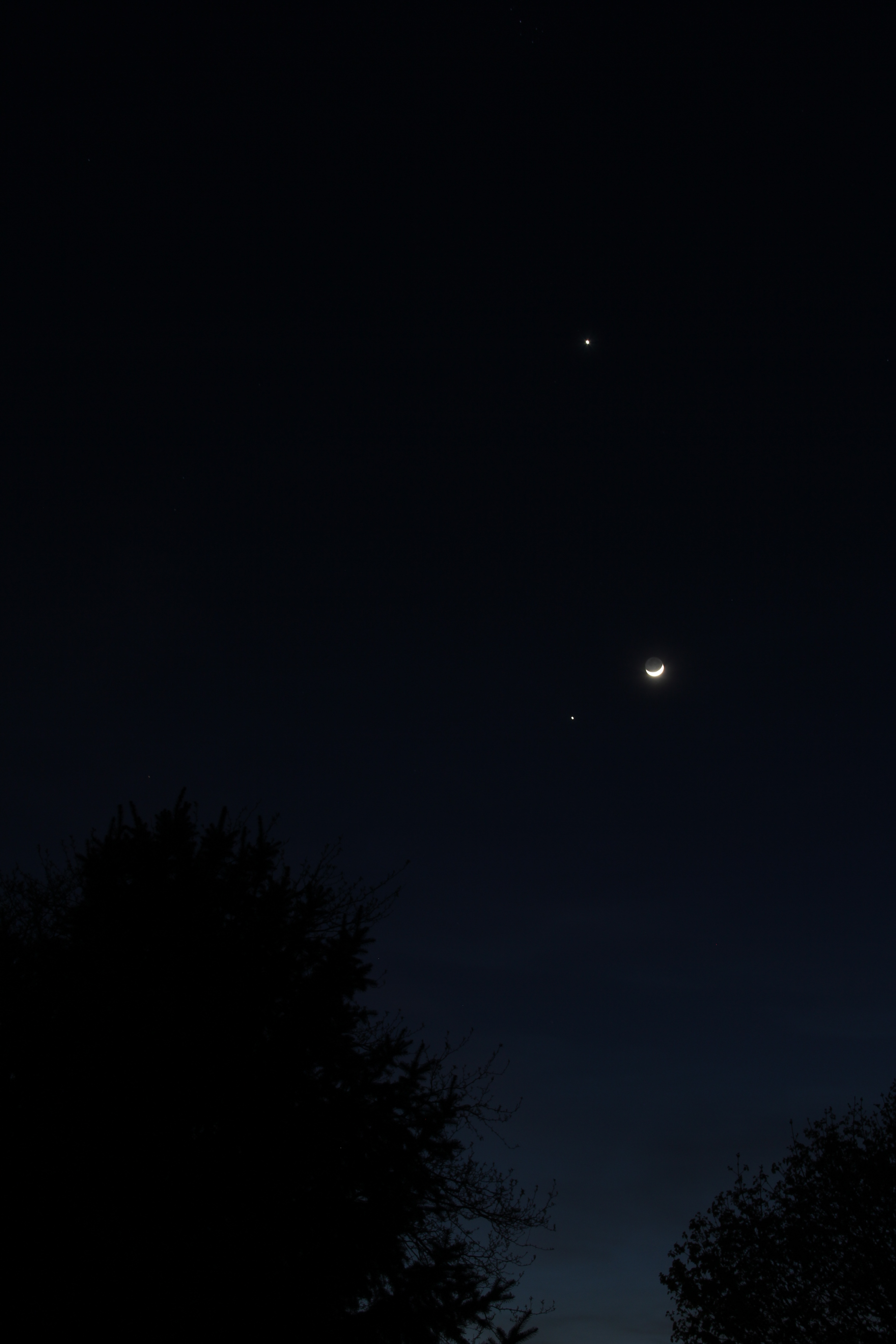 Historically March 25th has been a bad day for me. Today was a great day though, and the picture ideas just kept coming. As we left dinner though I noticed that the waxing moon was in between Jupiter and Venus. I have been wanting to get a good picture of this for a while now so I though that tonight was the perfect time. I was going to go out in the middle of nowhere to get this shot when I realized that I could get it from the driveway. I set up my tripod and tried a few long exposures to put together an HDR shot. I have had not luck with shooting HDR of the sky though so I took a couple of safeties near the end just to be sure. When I saw this picture in the viewfinder I knew that I had my shot. I have not had much luck shooting the sky yet, but I feel that I am getting better.