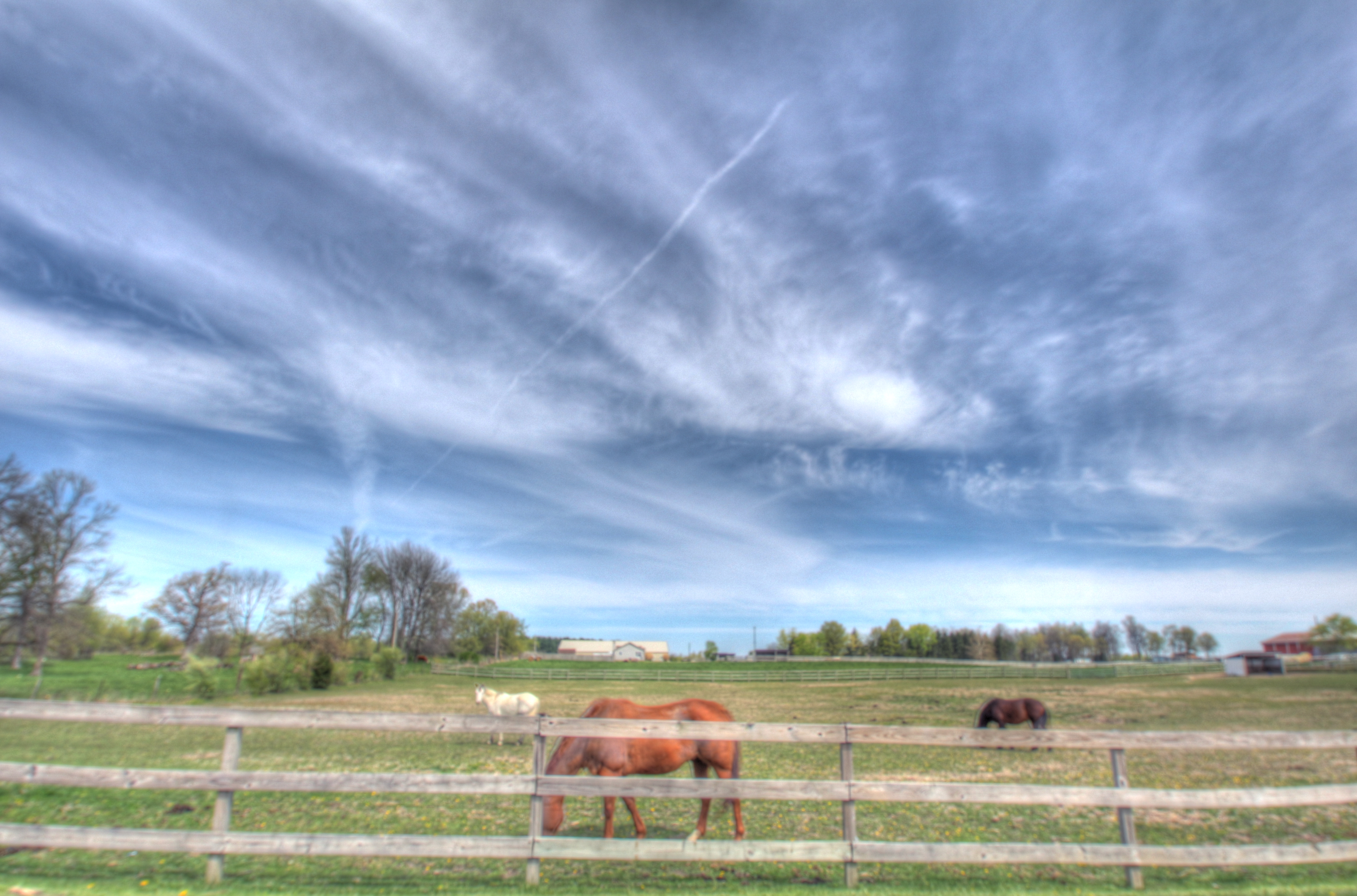 With the halfway point of this project rapidly approaching I am having trouble finding new landscape locations to show off. I have driven by this little field many times heading out to the windmills, but the horses were always very far away. Today they were closer to the fence so I decided to give it a shot. The clouds were the main reason that I went out to get a picture anyway so I was happy that they turned out okay. Early on in the HDR process my clouds were always very dark. I like the color that they turned here. Of course once again I was shooting six exposures on a very busy road so I didn’t have time to get out of the car. I would have liked to get a shot of the horses without seeing so much of the fence, but sometimes when you are rushed you have to just take what you are given. In the end I am happy with how this shot turned out, and how some of the things that I have learned so far have come together.