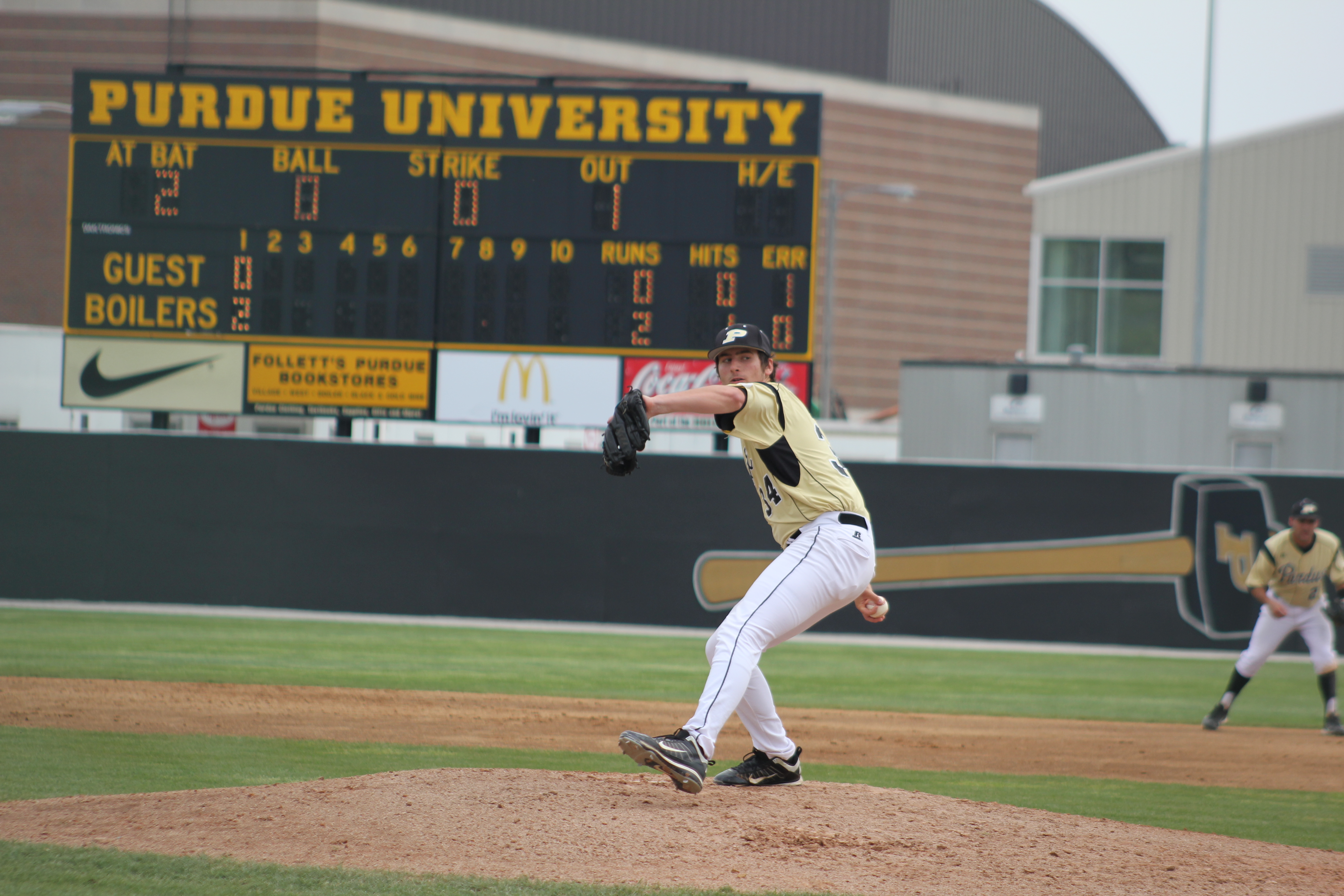 This picture is of LaPorte native Conner Podkul as he pitches in game two of a doubleheader today for Purdue. The Boilermakers won both games allowing another LaPorte native Doug Schreiber to both tie and break the record for most wins as a Purdue head coach. It was nice to see the LaPorte kid go down in the record books as the winning pitcher in that game. I have had fun shooting the Purdue games this week, and I have learned a little. I will try and build on that this coming week as I shoot a couple more games. For more shots from the game you can see my gallery on Google+ here.