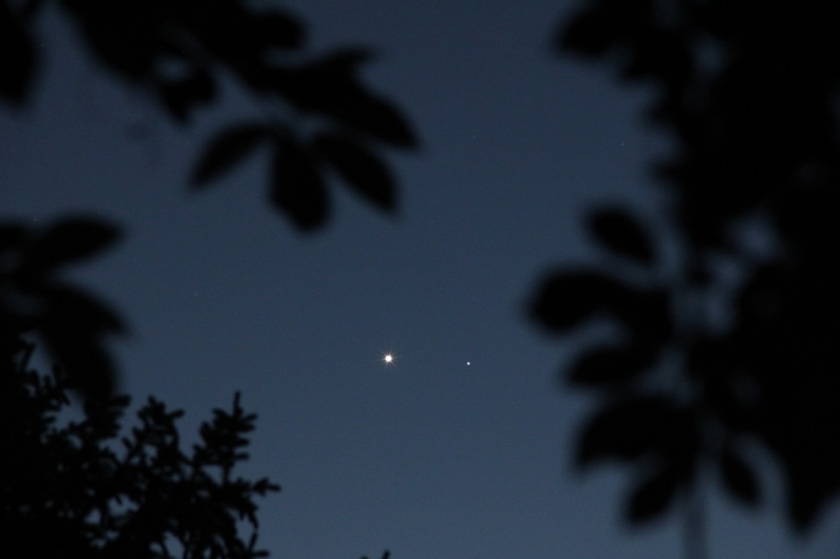 Today I went without a picture until about twenty minutes ago. I had a lot of bright ideas, but nothing came of them. I even had the words ‘picture idea’ spelled out in animal crackers before I decided to try and get something good. I went outside thinking that I could get a tree outline with the afterglow of the sun still in the air. It was then that I noticed this very bright star. Thanks to the Star Walk app on my phone I know that it actually is not a star, but a planet. Venus has been in a couple of pictures so far, and it makes another appearance today. I wanted to frame the star so I put a low hanging tree in the way. I went from having no picture at all to having a picture that I kind of liked. This is not my best work, but I am slowly getting better shooting the stars.