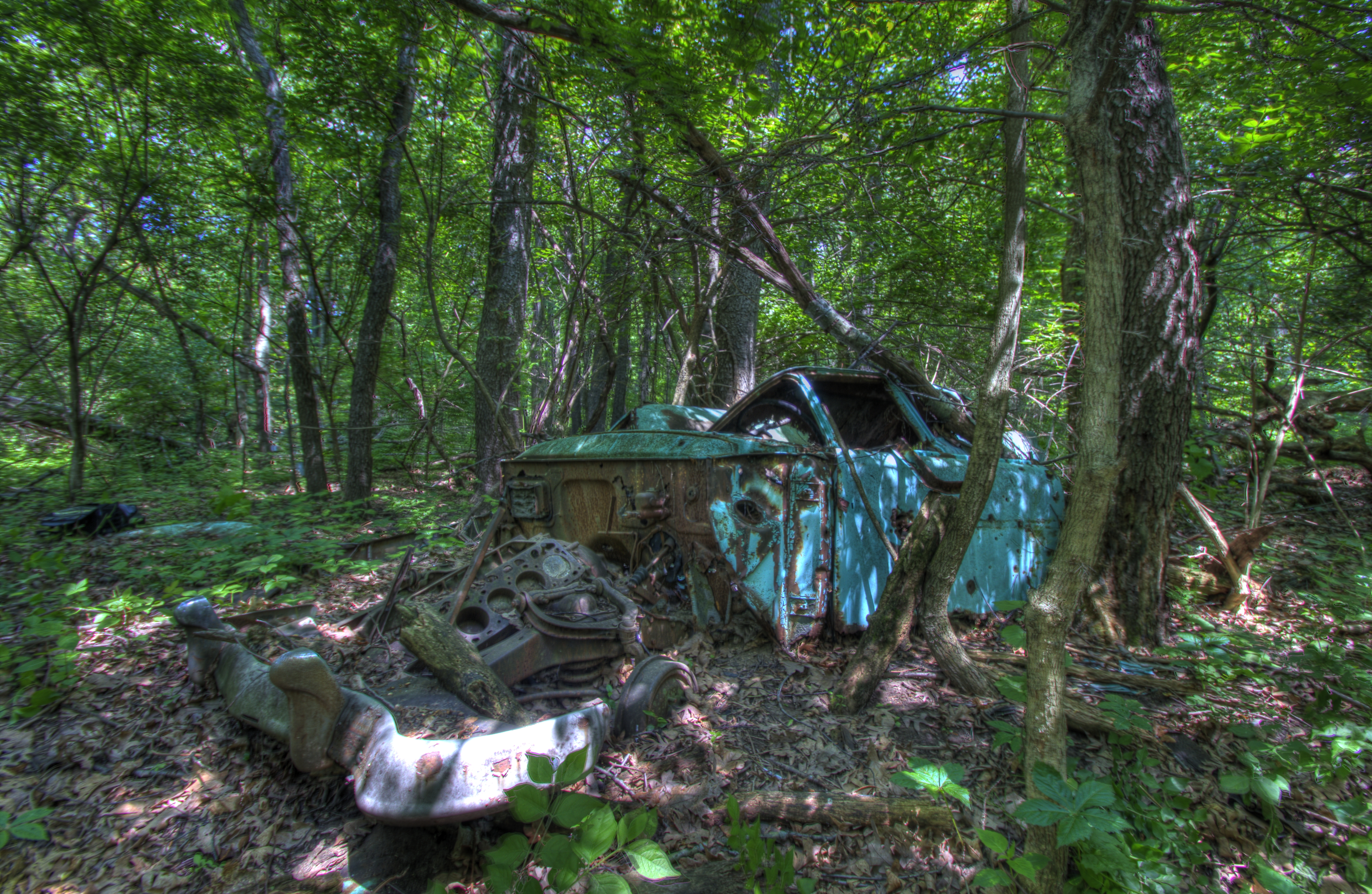 Yesterday I was back in my hometown for Mother’s Day. Just behind my parents house is a woods that we played in as kids. My brother and I went back there to see the old cars that fascinated us as kids. How could these old cars get back into a woods? The answer is just beyond them as an old road can still be made out in the woods. Time has started to have its way back here, but it is still pretty cool.