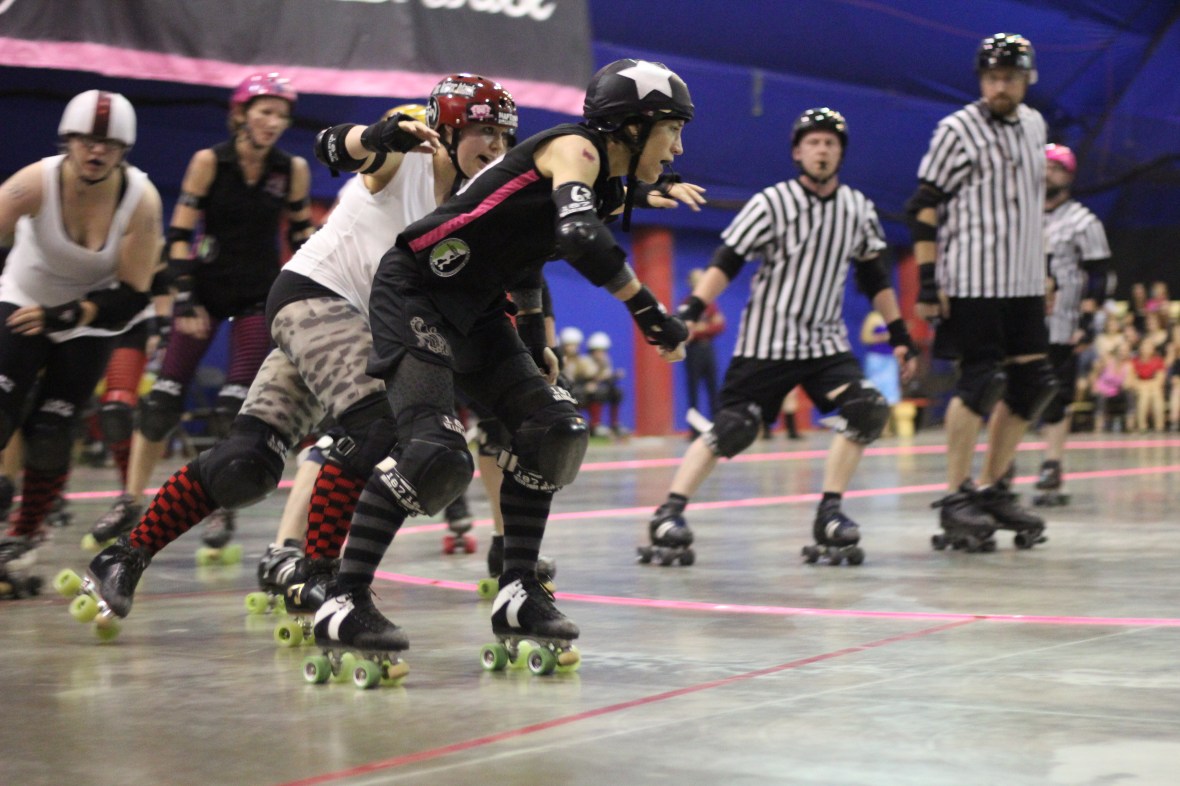 Last night I sat down in the suicide seats to shoot some of the bout between the Lafayette Brawlin’ Dolls and the Naptown Third Alarm. I only shot for the first half, but I snagged a couple of good pictures. With all of the movement on the track sometimes it is tough to capture your subject in motion the way that you would like. I had a couple of good ideas last night that sort of panned out. I used my 50mm lens again because it was the only one that could give me the light that I needed in the arena. By using it I could also lower my ISO a bit to get some shots that were not too grainy. This shot is of Brawlin’ Dolls jammer Sugar Magnolia getting around the last defender to become the lead jammer. If you do not know what that means don’t worry I didn’t either until a couple of months ago. The sport actually is very exciting, and I am a little sad that I have to wait until the end of June to shoot another one. The rest of my pictures from the bout can be found on my Facebook page here.