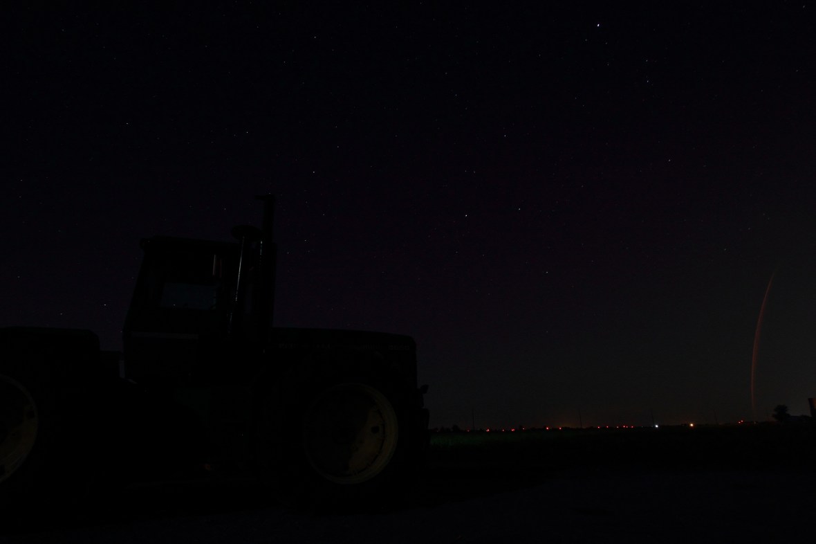 Tonight we went out close to midnight to get some pictures of star trails. When we got to the farm I realized that the moon was just too bright to get the trails in one long exposure. I decided to try the stacking method and put many 30 second exposures together. When I took a test shot I realized that you could not see any movement of the stars. What I liked though was the way that the stars looked with the tractor in the foreground. On my second shot I noticed that there was something in the lower right hand corner. I still do not know what it is. The only thing that I can think of is if a farmer had his irrigation on and the light from his farm lit it up. I am really not sure what I captured, but I liked it. I have another shot that might be a little bit better composed, but in the end I liked the anomaly in this shot enough to make it the picture of the day. Just after taking this picture a pack of coyotes walked up on us. I think both sides were startled a bit, but in the end I took a couple more pictures after a quick trip to the car. I like how this turned out so some more star photography might be in store on the weekends.