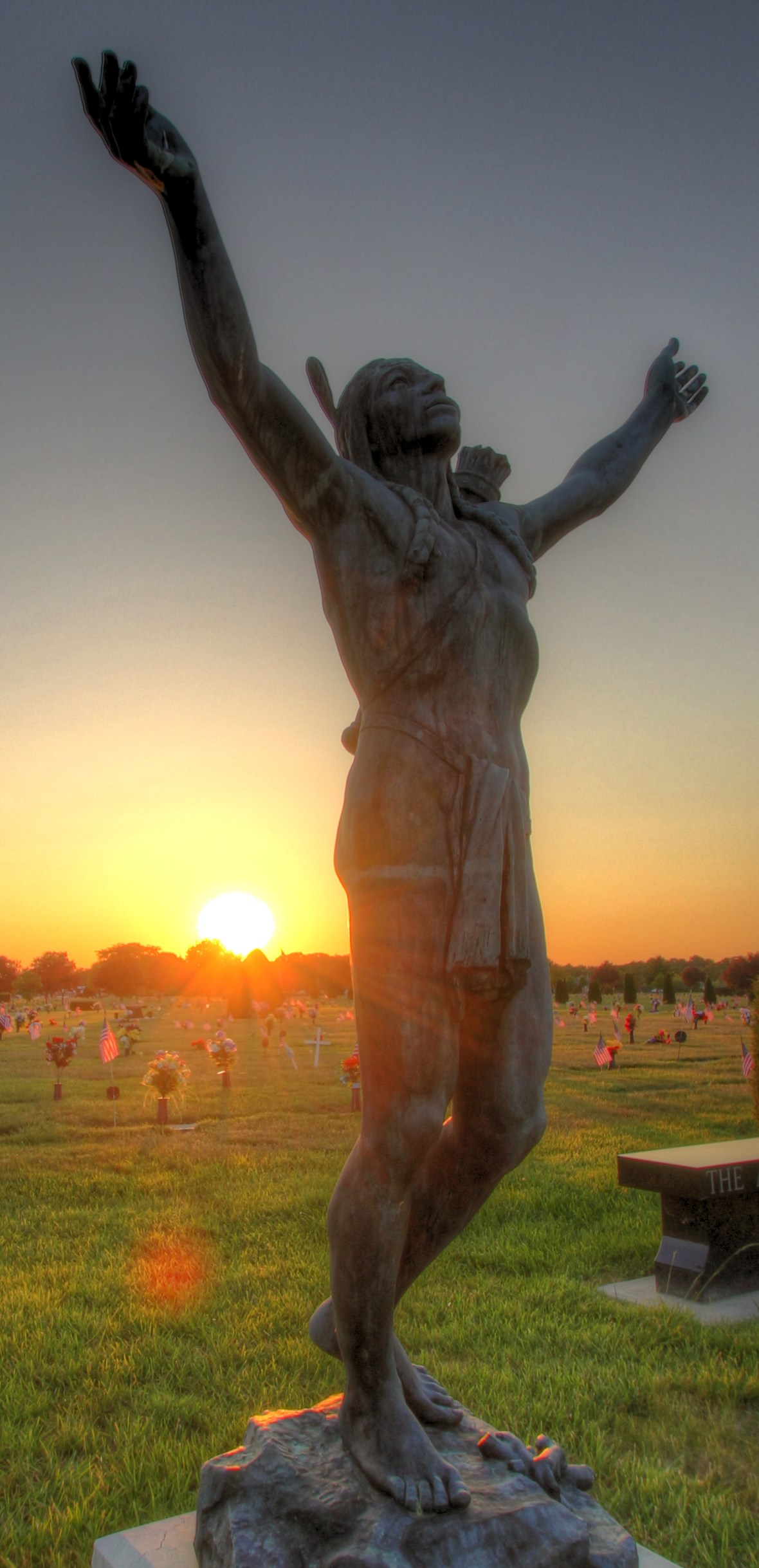 This statue in a local cemetery has always intrigued me. I have wanted to get a picture of it, but it just never seemed like the right time. Tonight I knew that the lack of clouds would make the sunset unimpressive. I was trying to find something to get quickly as I did not have a safety shot in case that situation arose. I saw the statue and thought that I would try something. I think that I captured the sunset pretty well with this shot. I was not sure on the scene, but after running it through Photomatix I liked the results. I installed some photoshop plugins today that I have seen on the Trey Ratcliff videos, but I liked this one the way that it was. Maybe I can try them out on tomorrow’s picture.