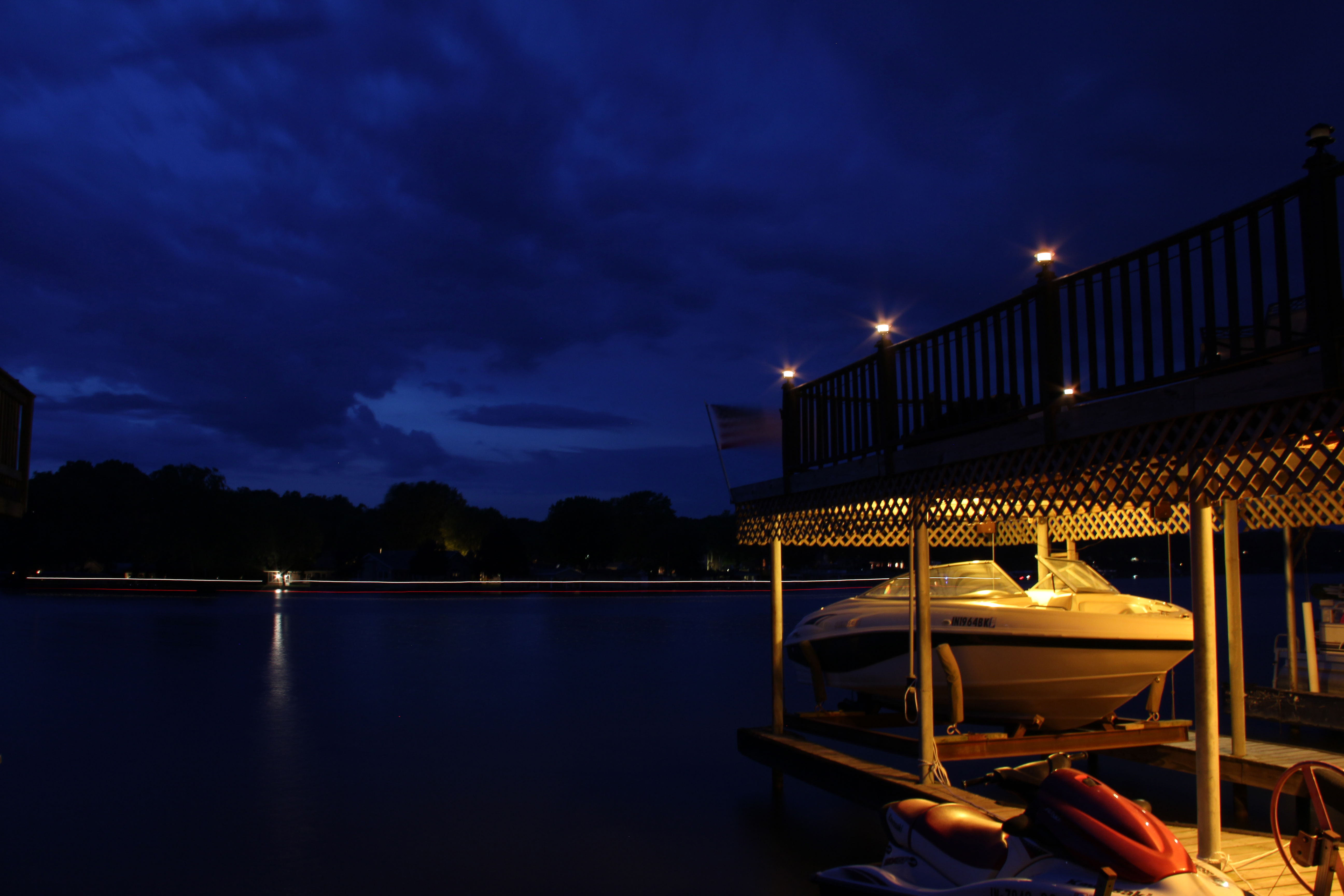 This picture really didn’t have a lot of post-processing done to it. Part of that is my fault. I cranked up the ISO a bit too much, and the HDR process was not having any of that. This picture was processed entirely in Photoshop. I used one of the two thirty second exposures into the program to clean it up a little. I then realized that I might be able to mask in the rest of the boat trail off of another exposure so that was done. It was a bit darker so it also allowed me to mask in some definition on the dock lights. In the end I think that less is more here, and the picture is one that I am happy with. The thirty second exposure really calmed the lake down from the choppy mess I saw into a nice peaceful looking body of water.