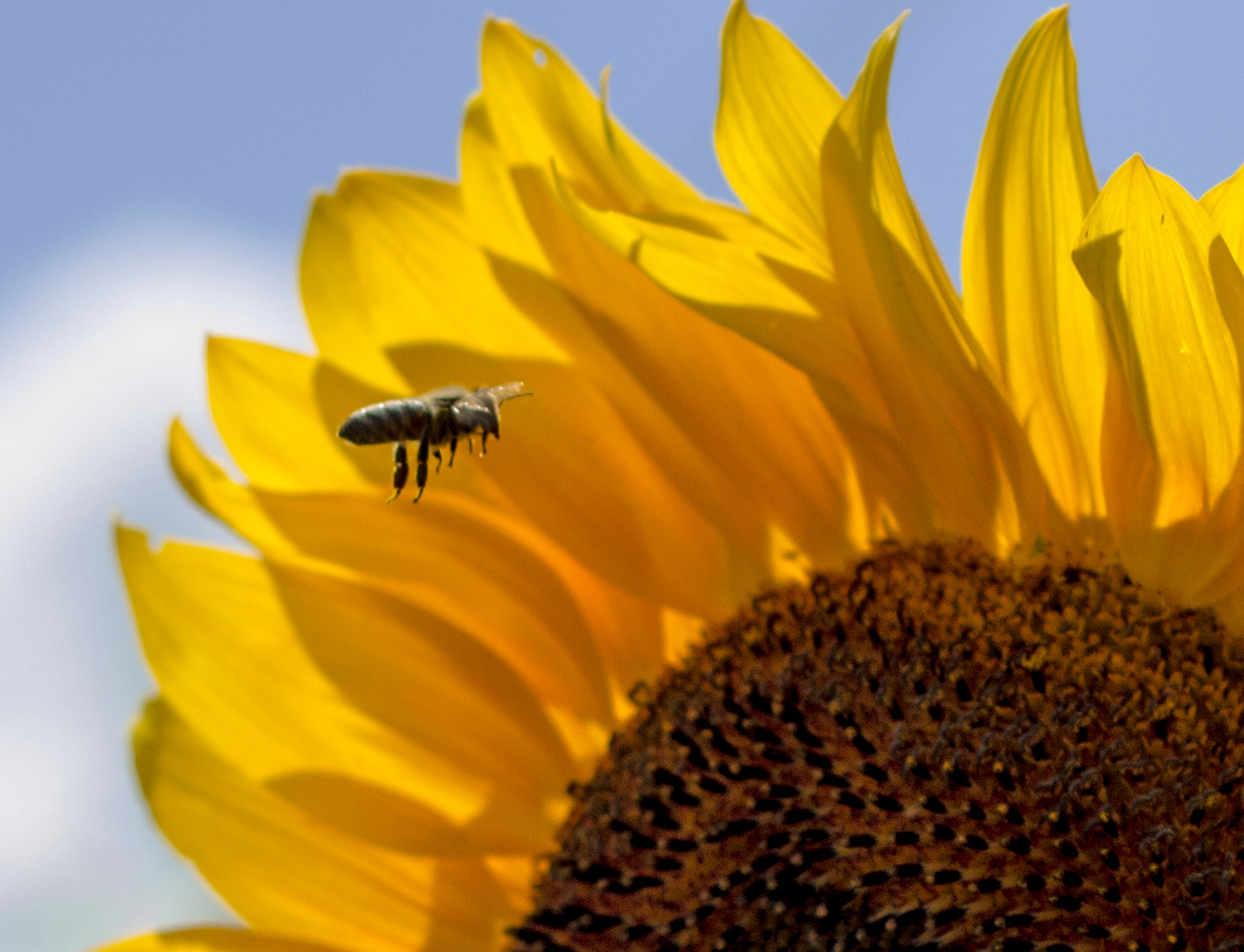 Today after work I drove just down the road to the community gardens. I don’t have a plot there, but earlier in the day I spotted some sunflowers. I thought that they would make a great picture. I tried my wide angle so that I could get the awesome blue sky and clouds in the background. I decided to swap out lenses to use my 50mm. When I stood up I noticed this bee fly on the sunflower. I tried to wait until he flew away or moved, but he was going nowhere. He finally showed some movement and I grabbed this shot.