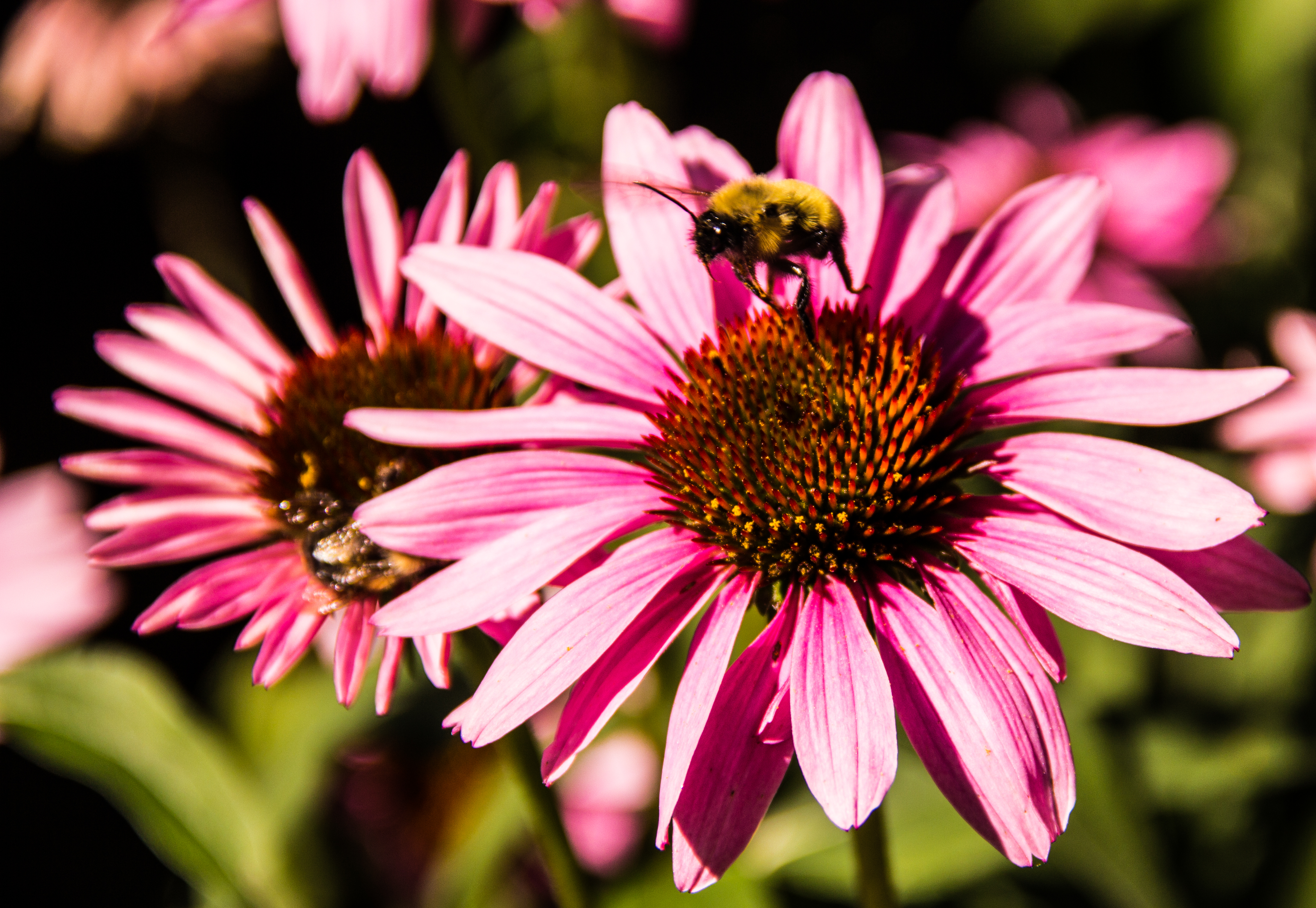 After another long day at work today I came home not knowing exactly what kind of photo I would take today. As I was pulling into the garage I noticed a couple of bees flying around the flowers out front. I realized that my opportunity for success was doubled by this fact. Little did I know that both of them would end up in this shot. Obviously the first bee in flying off of the flower in focus. The second bee is in the second flower that became the bokeh of the shot. This is not my most inspired work, but I am tired and not feeling very inspired today. Maybe tomorrow I will wake up with a beautiful scenic landscape ahead of me.