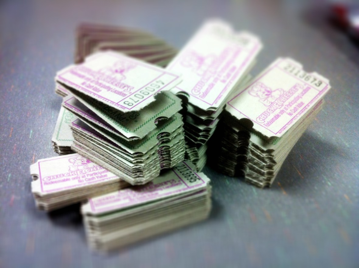 Yesterday we spent a portion of our day at Chuck E. Cheese’s for a birthday party. After all of the pizza eating and watching the entertainment it was time to get down to business. These machines had tickets in them, and it was our job to relieve the machines of those tickets. When we were done with our labor we sat down at a table to rest a bit. I put some of the tickets on the table in a pile with the thought that it might be a good picture. On a day with very little time to get out and get some pictures this turned out to be a good one. By the way my prediction that this would get us a pencil and an eraser turned out to be somewhat true although we did get a couple of more items along with those two.