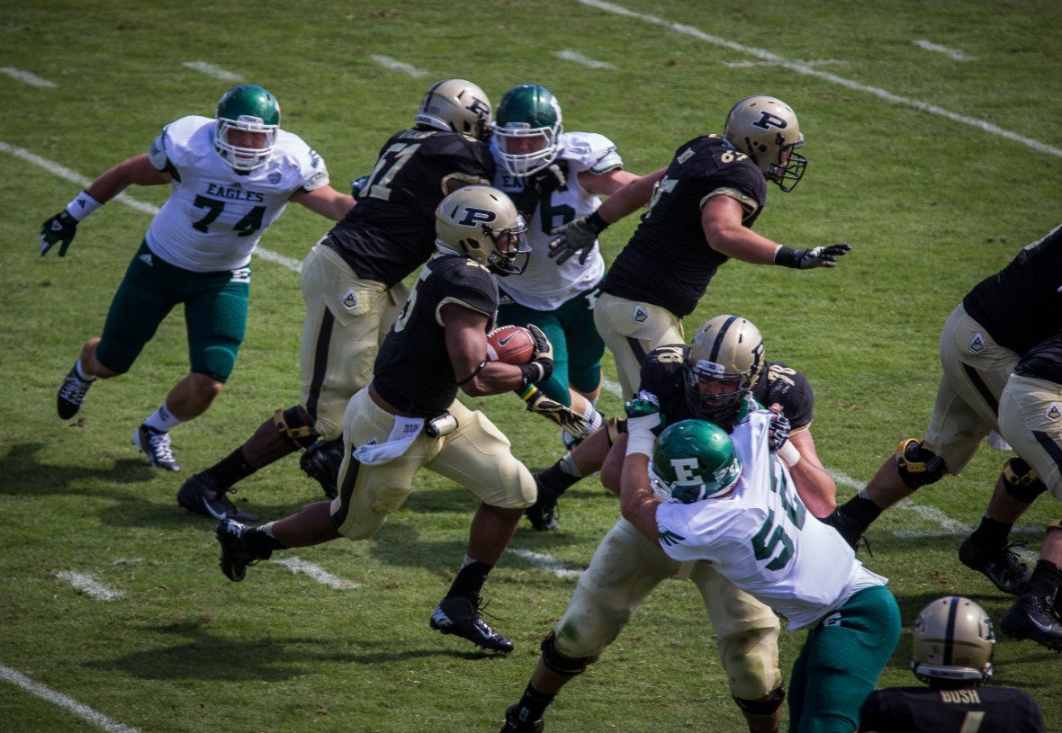 Today I attended the first half of the Purdue game against the Eastern Michigan Eagles. I would have liked to stay for the second half, but I had to get back to my hometown for a wedding. Who plans a wedding on a Purdue football weekend? The good news is that the game was over by the half, or the 33-9 score would tell you that anyway. I had a new vantage point again this week so the angle is a bit different. Two scores happened right in front of me, but a gentleman with quick hands led to my shots having arms in them. The arms are in focus, but I didn’t think that they were in focus enough to be the picture of the day. This picture is of Purdue running back Brandon Cottom at the start of his 87 yard touchdown run. Cottom is the big running back so the huge run was a bit unexpected, at least to me. I liked how this shot looked early in the big run so I thought that it could be the photo of the day.