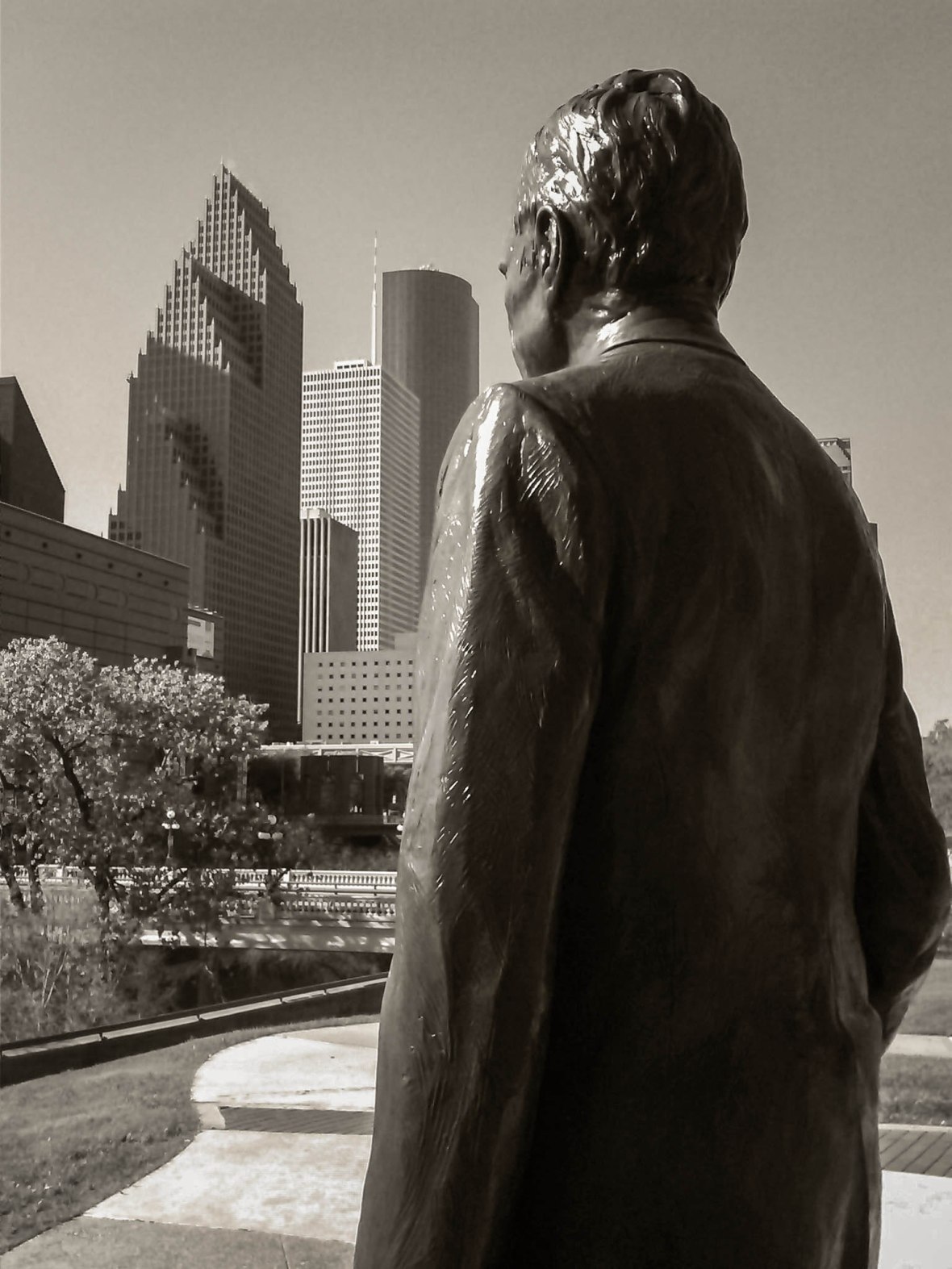 This should be an iPhone photo today, but in order to keep with the Presidential theme I had to go back a bit to an older Blackberry Storm picture. I took this in the spring of 2010 while in Houston to see the Boiler basketball team play. As usual I try and see some historical sites along with my sports endeavors. While in Texas I went to both the Lyndon Johnson and the George H.W. Bush Presidential museums. I liked them both, and really had a good time there. While driving around on our last day I saw this statue looking towards the downtown area of Houston. After a quick illegal parking maneuver I was in position to get a couple of shots. I liked making pictures from the front, but I also liked this view from behind. In the end this was my favorite shot from the rushed double parked shoot.
