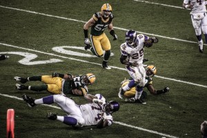 I thought that since the Packers and Vikings were playing tomorrow that I would share this image that I took in 2009 when I was at that game in Lambeau. I have always liked this picture of Adrian Peterson looking upfield. My luck in seats that day really allowed me to get some shots that I would not have thought possible when I was initially looking into the trip. I love the eyes of both Adrian as well as Clay Matthews who is chasing him down. If you look closely you will also see Charles Woodson and Brett Favre in the shot. This is one of my favorite images from that day.